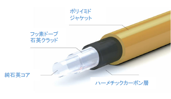 耐ソラリゼーション、耐放射線 石英光ファイバー 科研費向け出展製品一覧 2026.02.032026.02.24 (株)ティー・イー・エム セーラムオプテック社の石英コア/石英クラッドにハーメチックカーボン層で構成された本ファイバーは、ソラリゼーション耐性に優れており、深紫外波長照射による劣化を抑えます。また、ハーメチックカーボン層の働きで、放射線下での使用にも適しています。コア径50umから1500umまで製造実績があります。ファイバー素線はもちろん、コネクタを付けたり、ファイバーを束ねてバンドルとして販売する事も可能です。1本から特注対応いたします。 価格:お問い合わせください。 科研費申請対応製品一覧ページへ戻る トップページへ戻る